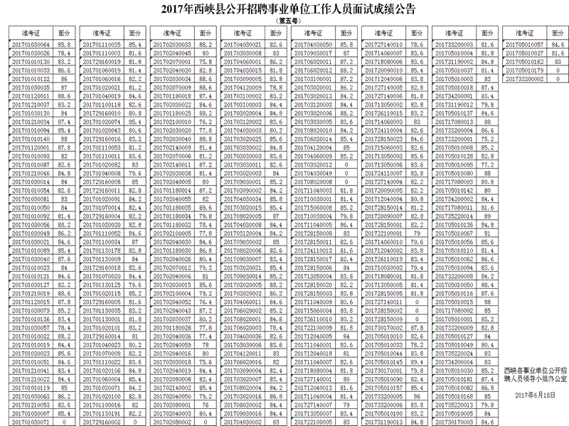 2017年西峡县公开招聘事业单位工作人员面试成绩公告