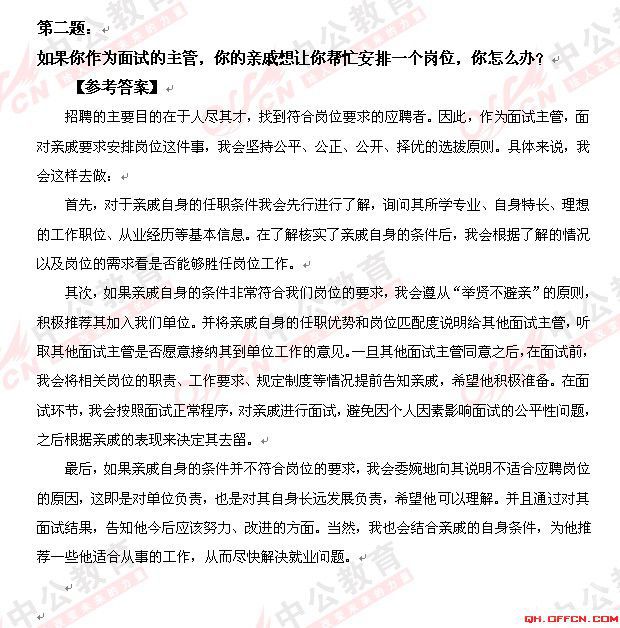 第二题:如果你作为面试的主管,你的亲戚让你帮忙安排一个岗位,你怎么办?