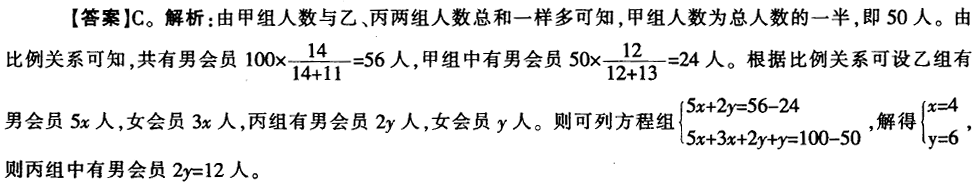 2013年山东省济南市市属《综合基础知识》:某团体有100名会员,男、女会员人数比为14:11。会员分为三组,甲组人数与乙、丙两组