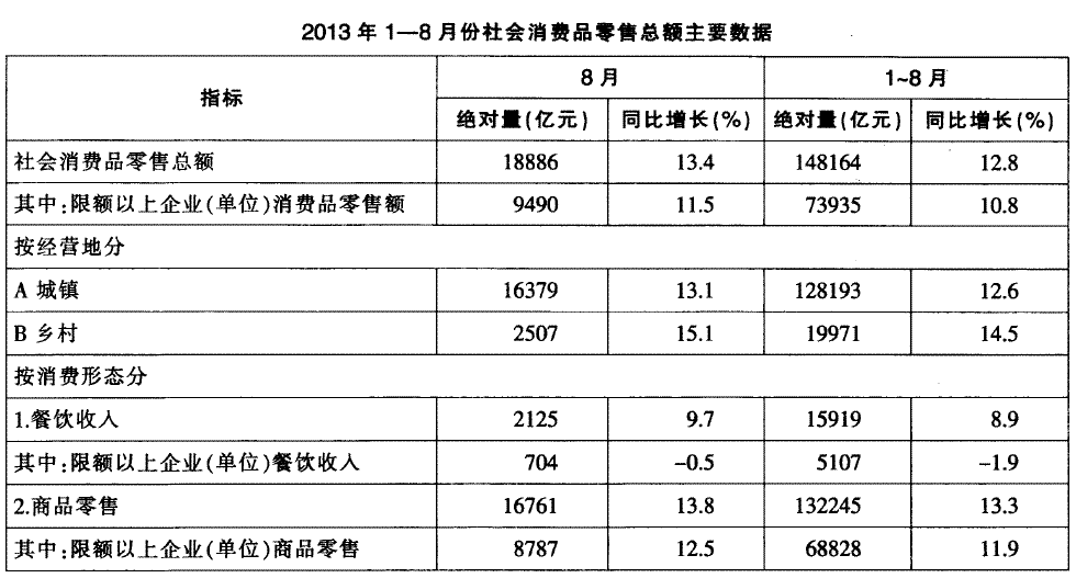 2013年8月份,社会消费品零售总额18886亿元,同比名义增长13.4%(扣除价格因素实际增长11.6%。以下除特殊说明外均为名义增长)。其中,限额以上企业(单位)消费品零售额9490亿元,增长11.5%。1—8月份,社会消费品零售总额148164亿元,同比增长12.8%。