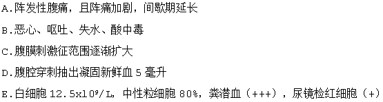 【答案】C。专家解析:剖腹探查指征:①腹痛和腹膜刺激征进荇性加重或范围扩大;②肠蠕动减弱、消失或出现明显腹胀;③全身情况明显恶化;④膈下有游离气体;⑤红细胞计数进行性下降;⑥血压不稳定或继续下降;⑦腹腔穿刺吸出气体、不凝固血液、胆汁或胃肠内容物。