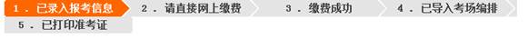 单击“返回”按钮,返回初始页面。特别提醒:请认真查看此页面最上面的流程,(一般为 已录入报考信息—--资格审查----缴费成功----已导入考场编排----打印准考证)(资格审查流程视情况而定)。考生目前在哪个流程都会显示为橙色,如: