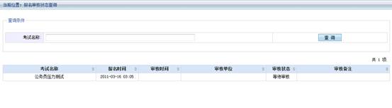 2、 输入考试名称,单击【查询】按钮,则在列表中显示相应考试的审核状态。、