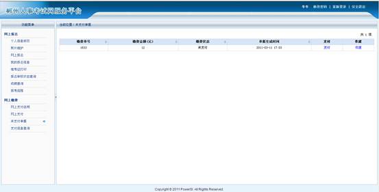 2、 输入查询条件:缴费单号,开始时间和结束时间。单击“查询”按钮,在页面下方的列表中显示符合查询条件的支付信息。