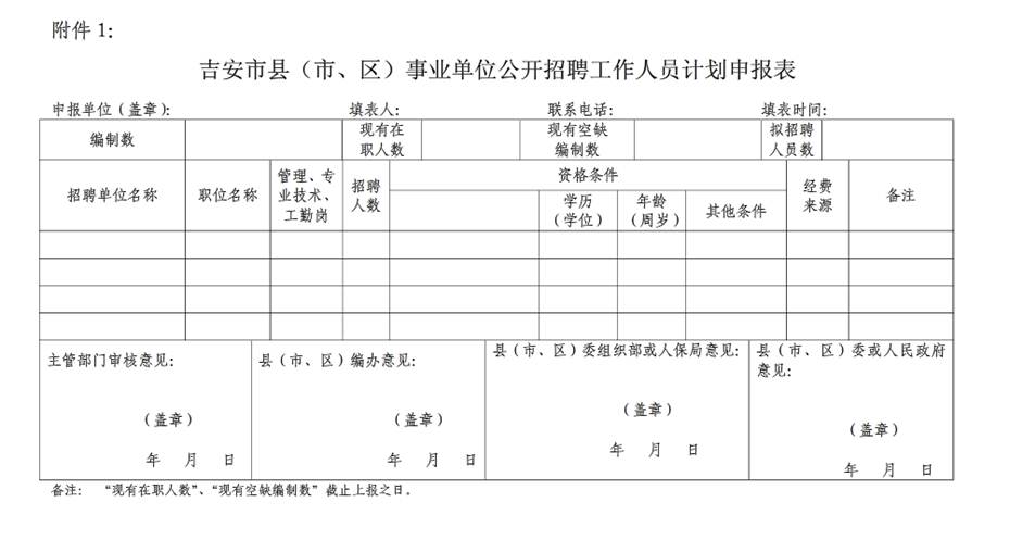 4、计划申报表分别按招聘、选调填写一式四份加盖单位及主管部门公章后报井冈山市人才交流中心(电子版发送邮箱:jgssbb@163.com)。