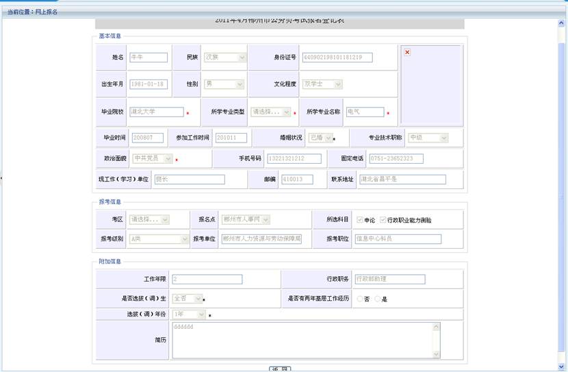 2、 单击列表中“详细”按钮,页面显示报名登记表;