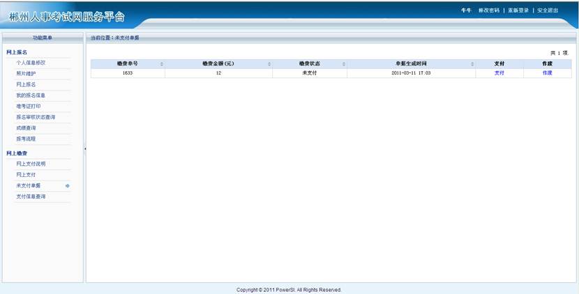 功能描述:查看人员未支付的单据信息,并对其进行支付或者作废操作。