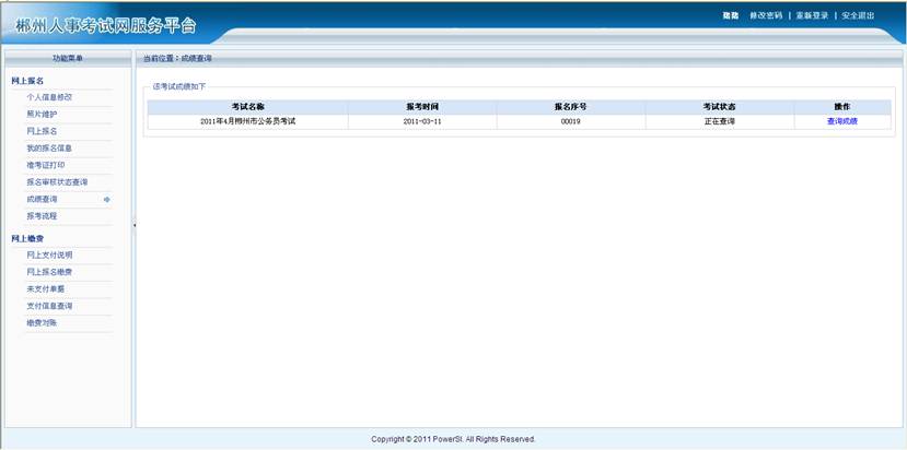 1、 单击【成绩查询】,打开考生成绩查询页面。如下图: