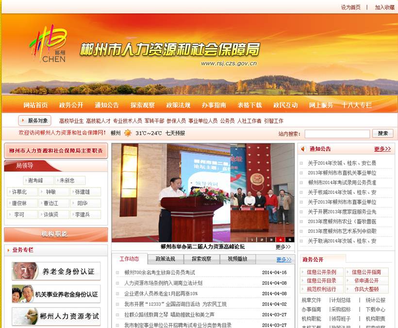 2、 方式二:从郴州市人力资源和社会保障局网站的链接进入,即在浏览器地址栏输入郴州市人社局网址:http://www.rsj.czs.gov.cn/,登录到人社局网站,如下图所示: