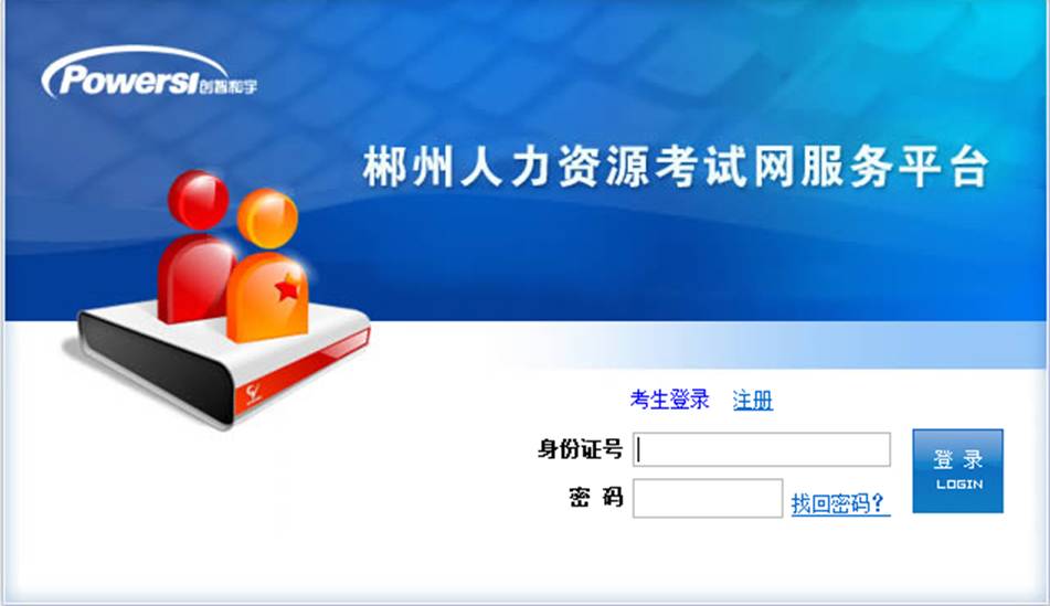 2、 在快捷通道下的考试类型模块下,选择本次考试的登录平台,填写身份证、密码。单击“登录”按钮,页面进入郴州人事考试网服务平台。
