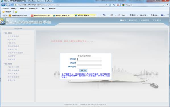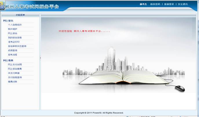 6、 密码修改成功后,即登录到了郴州市人事考试网服务平台,如下图所示: