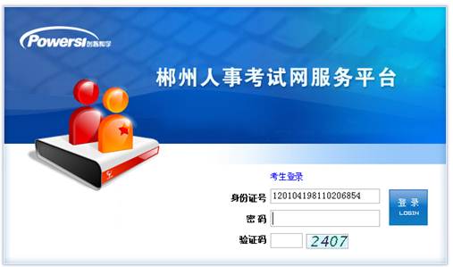 2、 在快捷通道下的考试类型模块下,选择本次考试的登录平台,填写身份证、密码和验证码(或者点击首页上,按提示进入登录页面)。单击“登录”按钮,页面进入郴州人事考试网服务平台。