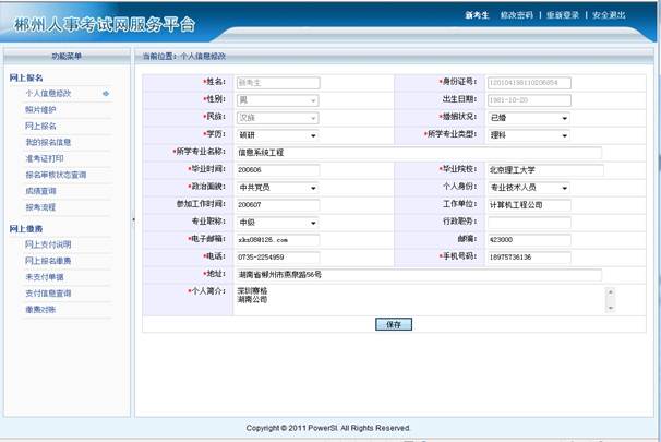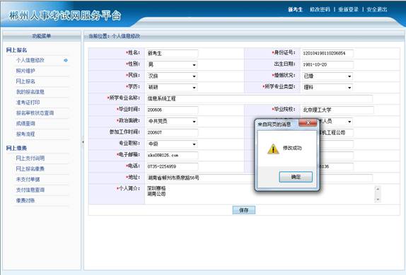 1、 单击【个人信息修改】,打开个人信息修改页面,如下图: