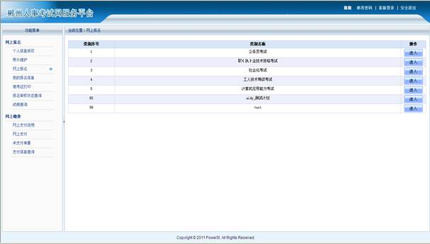 2、 选择需要报考的类别,例如:事业单位考试。单击对应的“进入”按钮,显示该类别考试的相关信息。如下图: