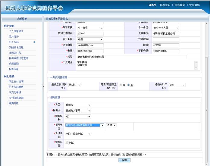 功能描述:用户打开郴州人事考试网站之后,要先注册个人真实信息,才能进行报名。