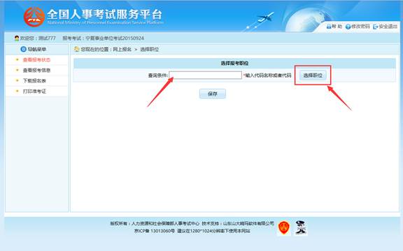 选择相应的职位,点击“保存”按钮,提示保存成功,可以跳转到报考流程页面,如下图所示: