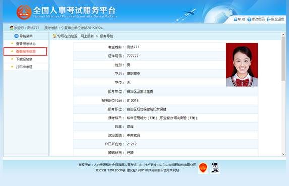 通过点击系统导航菜单的“查看报考信息”选项,可进入查看考生报考信息的页面,如下图所示: