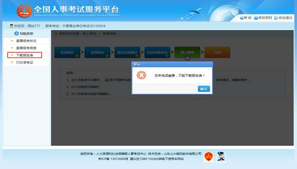 通过点击系统导航菜单的“下载报名表”选项,可以下载考生信息表;下载考生信息表操作必须在考生完成缴费之后才能操作(免笔试考生审核通过即可进行操作),如果考生未完成缴费点击“下载报名表”选项,系统会提示“您未完成缴费不能下载报名表”,如下图所示: