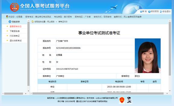 考试前一周,通过点击系统导航菜单的“打印准考证”选项,可进入准考证打印页面,如下图所示: