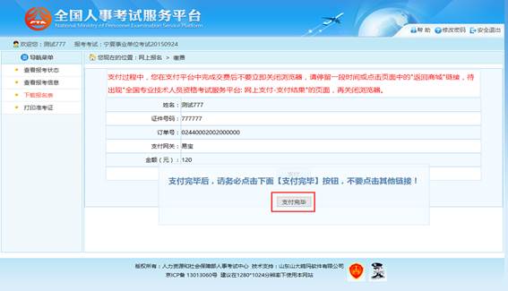 订单确认无误后,点击“支付”按钮,成功后再点击“支付完毕”按钮完成网上支付操作操作,如下图所示: