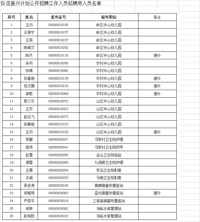 根据西安市人社局《关于做好2015年西安市农村基层人才队伍振兴计划公开招聘工作的通知》精神,经过报名、资格审查、笔试、面试、体检、考察等程序,已确定王丹等26人为2015年蓝田县农村基层人才队伍振兴计划公开招聘工作人员拟聘用人员,现公示如下,公示期为2015年8月14日-8月20日。