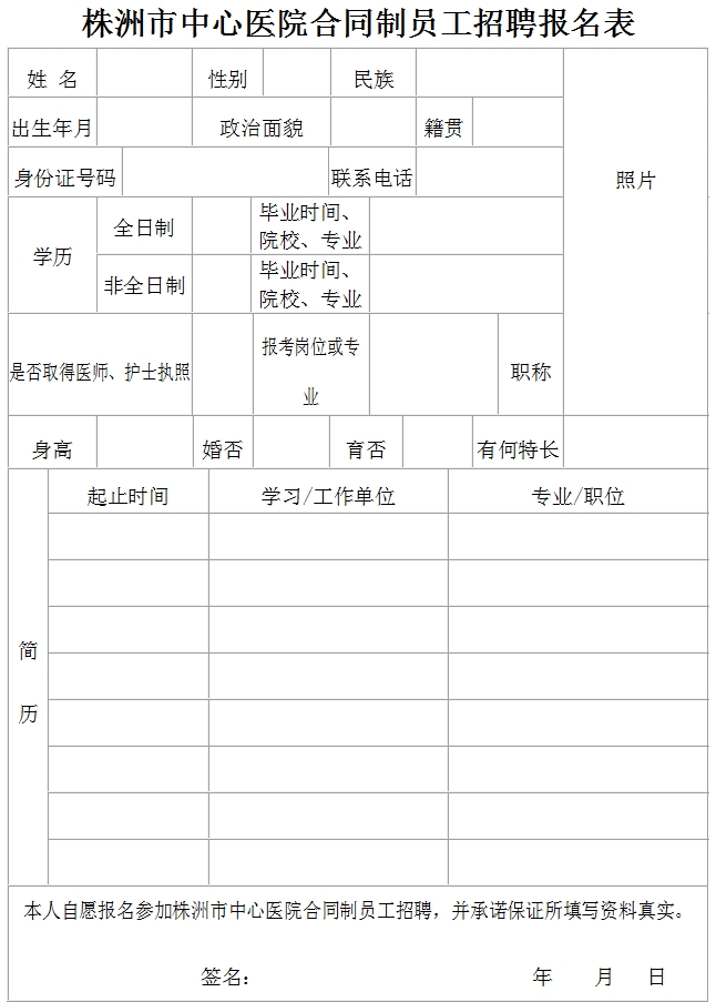 1.《株洲市中心医院合同制员工招聘报名表》请到附件中下载,按实填写并打印,亲笔签名,贴好照片后,现场交至人事教育科312房间。