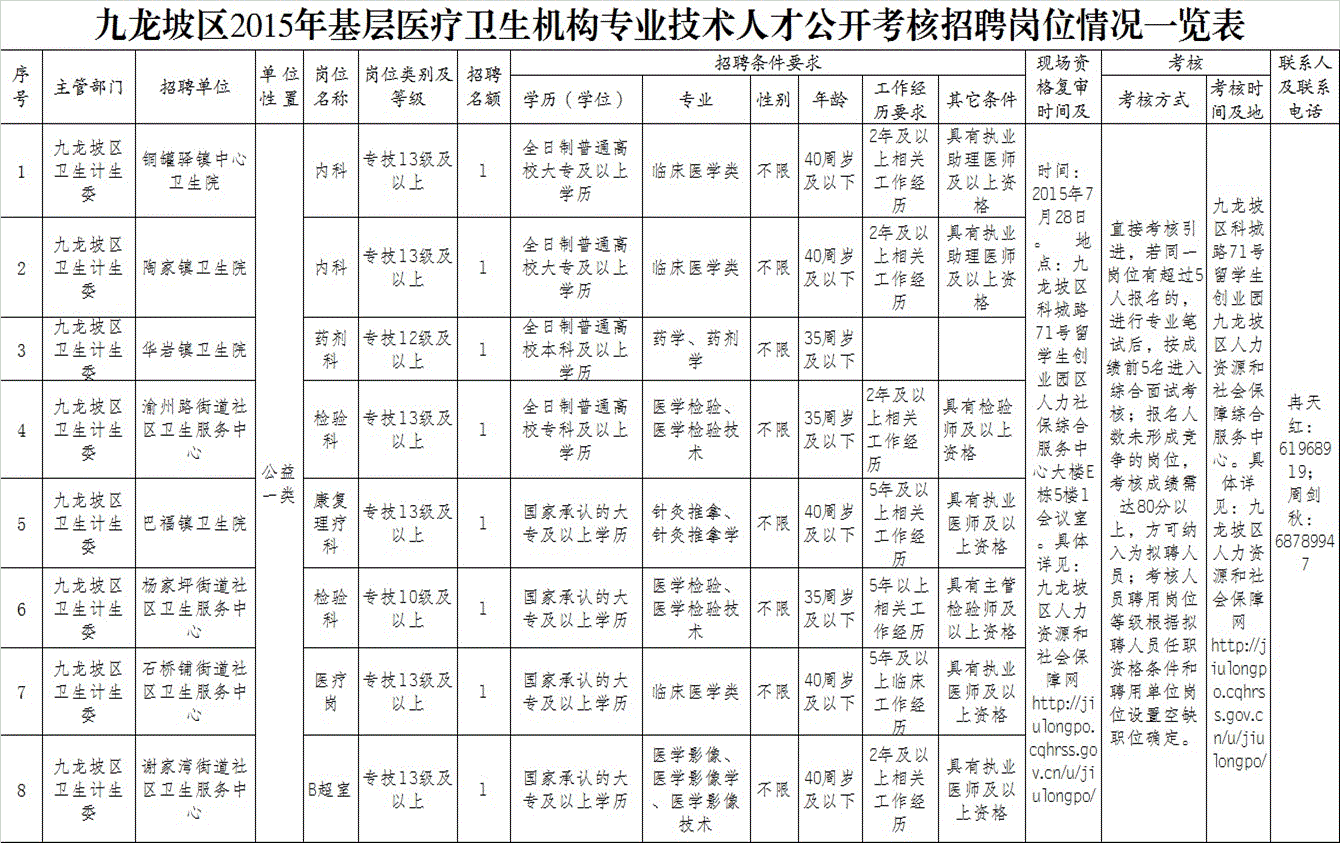根据《2015年重庆市基层医疗卫生事业单位公开考核招聘专业技术人员公告》相关规定,现将九龙坡区2015年公开考核招聘基层医疗卫生机构专业技术人才资格复审及考核相关工作通知如下: