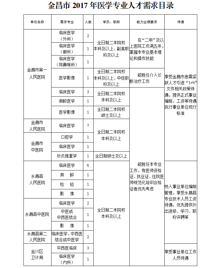 2017年金昌市计划引进临床医学等专业人才39名,引进对象为相关院校全日制大学二本及以上学历临床医学等专业毕业生。