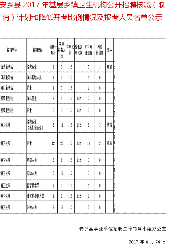 原标题:安乡县2017年基层乡镇卫生机构公开招聘核减(取消)计划和降低开考比例情况及报考人员 名单公示