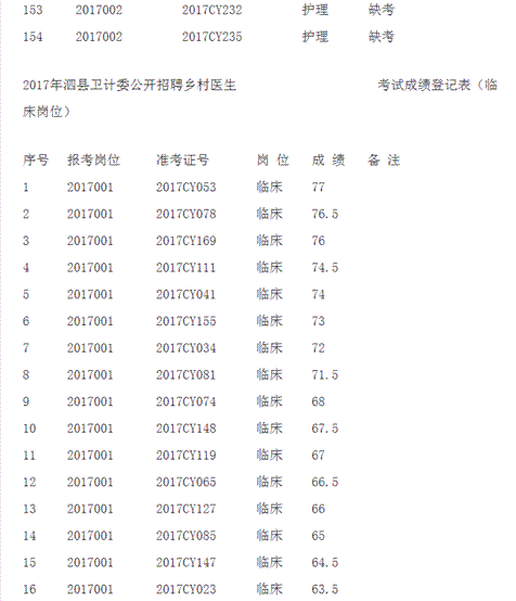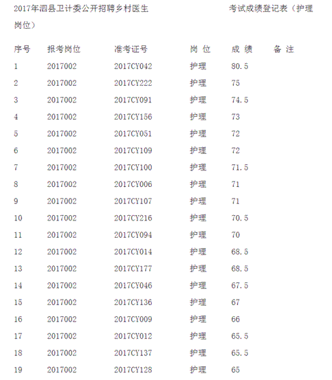 原标题:2017年泗县卫计委面向社会公开招聘乡村医生考试成绩公布