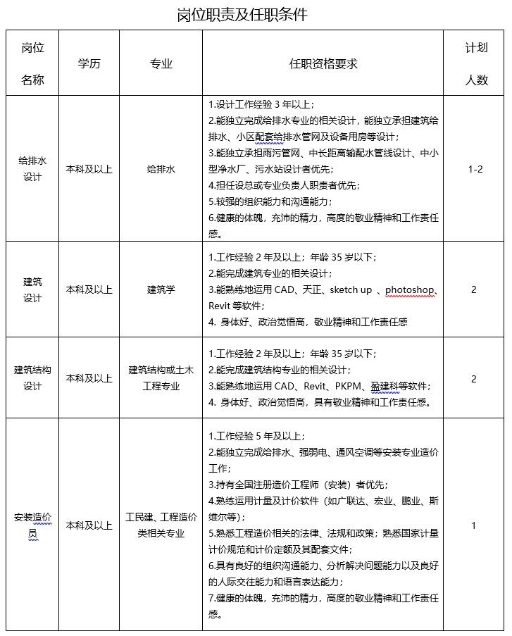 为满足生产需要,经研究决定,现公开招聘给排水设计人员1-2名、建筑设计人员2名、建筑结构设计人员2名以及安装造价员1名,岗位要求详见下表:(请点击链接查看详情)