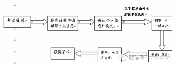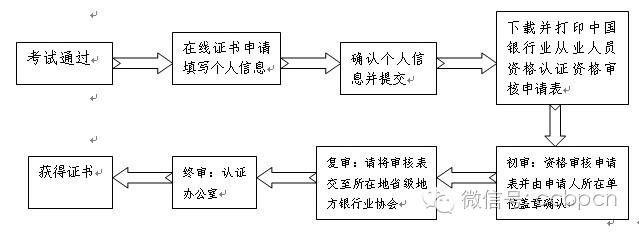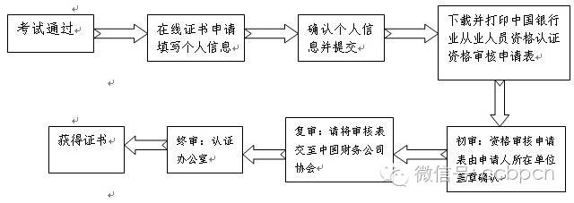 其他银行业金融机构的从业人员在提交证书申请后,应打印《中国银行业从业人员资格认证资格审核申请表》,由所在单位人力资源部门对该申请人职业操守进行审核并盖章确认。并于2016年6月27日9:00-7月15日17:00前将资格审核申请表交至所在地省级银行业协会进行复审。由认证办公室对证书申请进行终审,通过资格审核的从业人员将获得资格证书。具体工作流程见下图:
