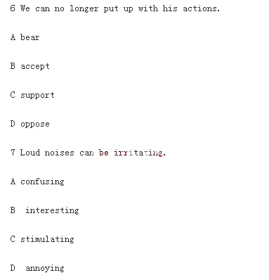 下面共有15个句子,每个句子中均有1个词或短语画有底横线,请从每个句子后面所给的4个选项中选择1个与画线部分意义最相近的词或短语。请将答案涂在答题卡相应的位置上。