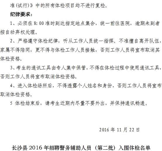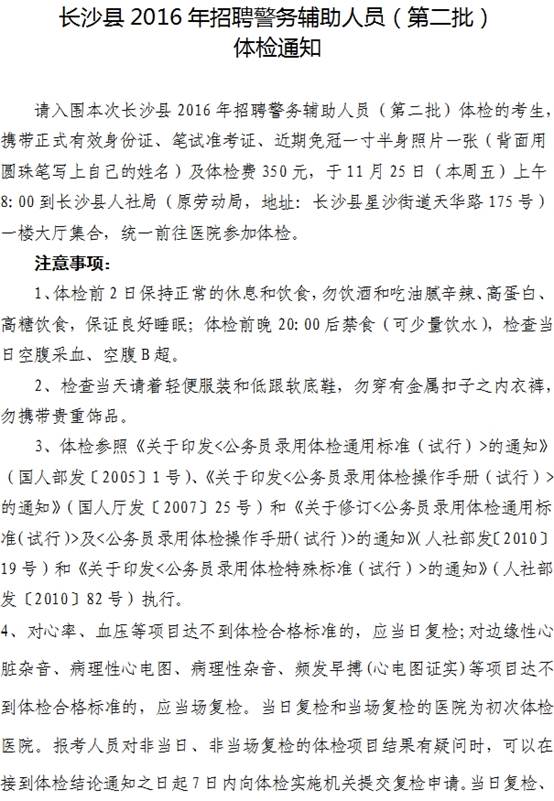 原标题:长沙县2016年招聘警务辅助人员(第二批)体检通知