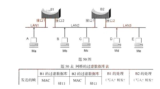 50.透明网桥通过维护一个基于MAC地址的过滤数据库实现位于不同局域网的站点之间的数据转发。设有五个站点(其MAC地址分别为Ma、Mb、Mc、Md、Me)的三个局域网通过两个透明网桥连接,每个网桥有接口1和接口2,如题50图所示。在网络初始状态,两个网桥的过滤数据库为空。随后网络中发生了如下数据帧的成功发送:A发送给E,C发送给A,D发送给C,E发送给D。在题50表中的(1)~(14)处填入两个网桥的过滤数据库内容及网桥相应的处理操作。(在答题纸上作答)