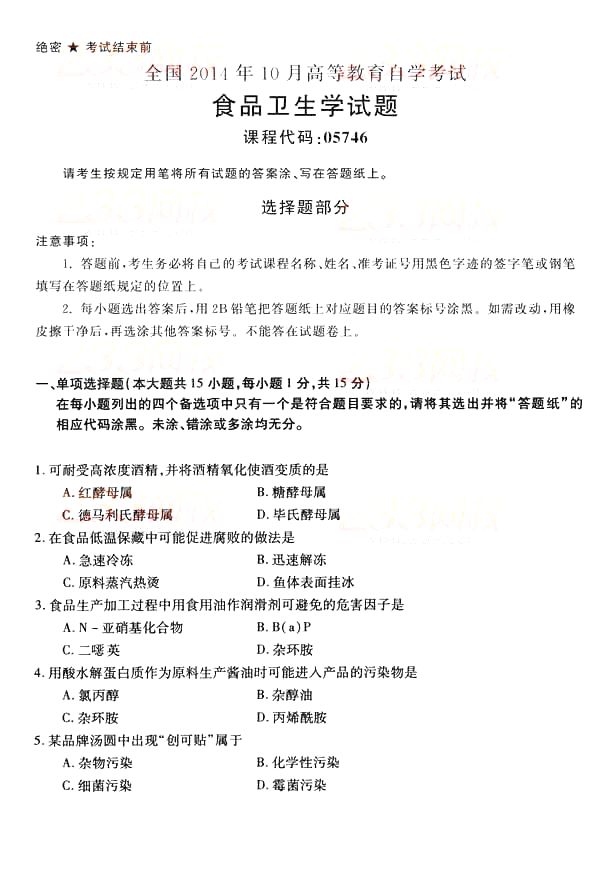 全国2014年10月自学考试《食品卫生学》真题(完美word版)(一)